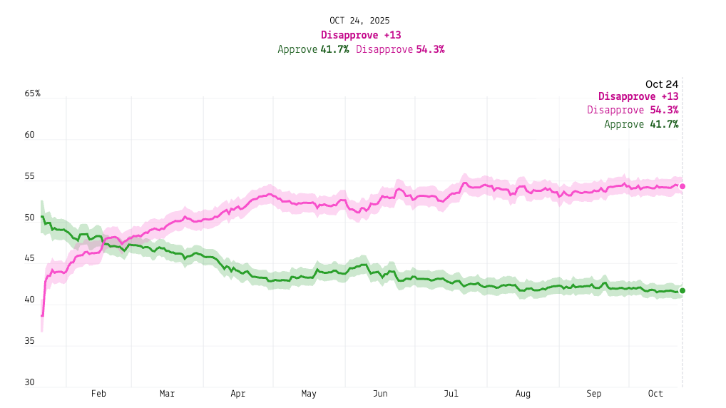 This surprised me a bit, because in my view, the prior week was relatively good for Trump (with relative doing a lot of work there), most notably: the Gaza “ceasefire” getting overwhelmingly and uncritically effusive praise from many in the media. Nevertheless, Trump’s approval rating continued its slow decline.