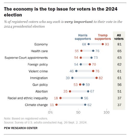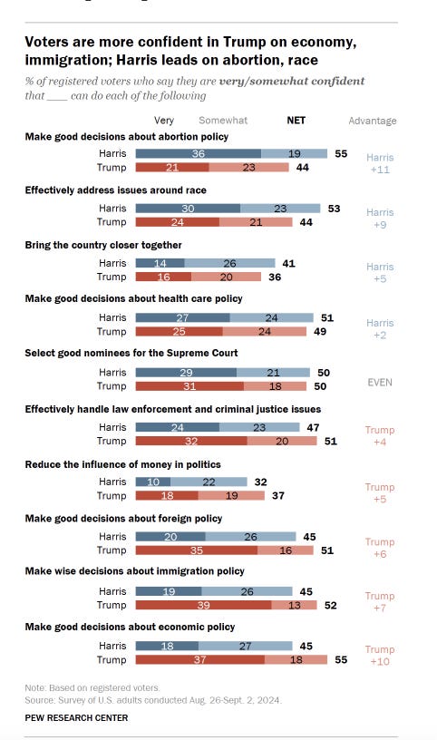 If you read the (second) chart from Pew, Kamala Harris was trusted on race and abortion MORE than Donald Trump was trusted on immigration. This is not an argument for Democrats to avoid moderating on cultural issues; I generally support that, just analytically, cultural explanations do not explain the results of the 2024 election. Donald Trump won gettable voters concerned about affordability and cost-of-living issues and thus won the election.